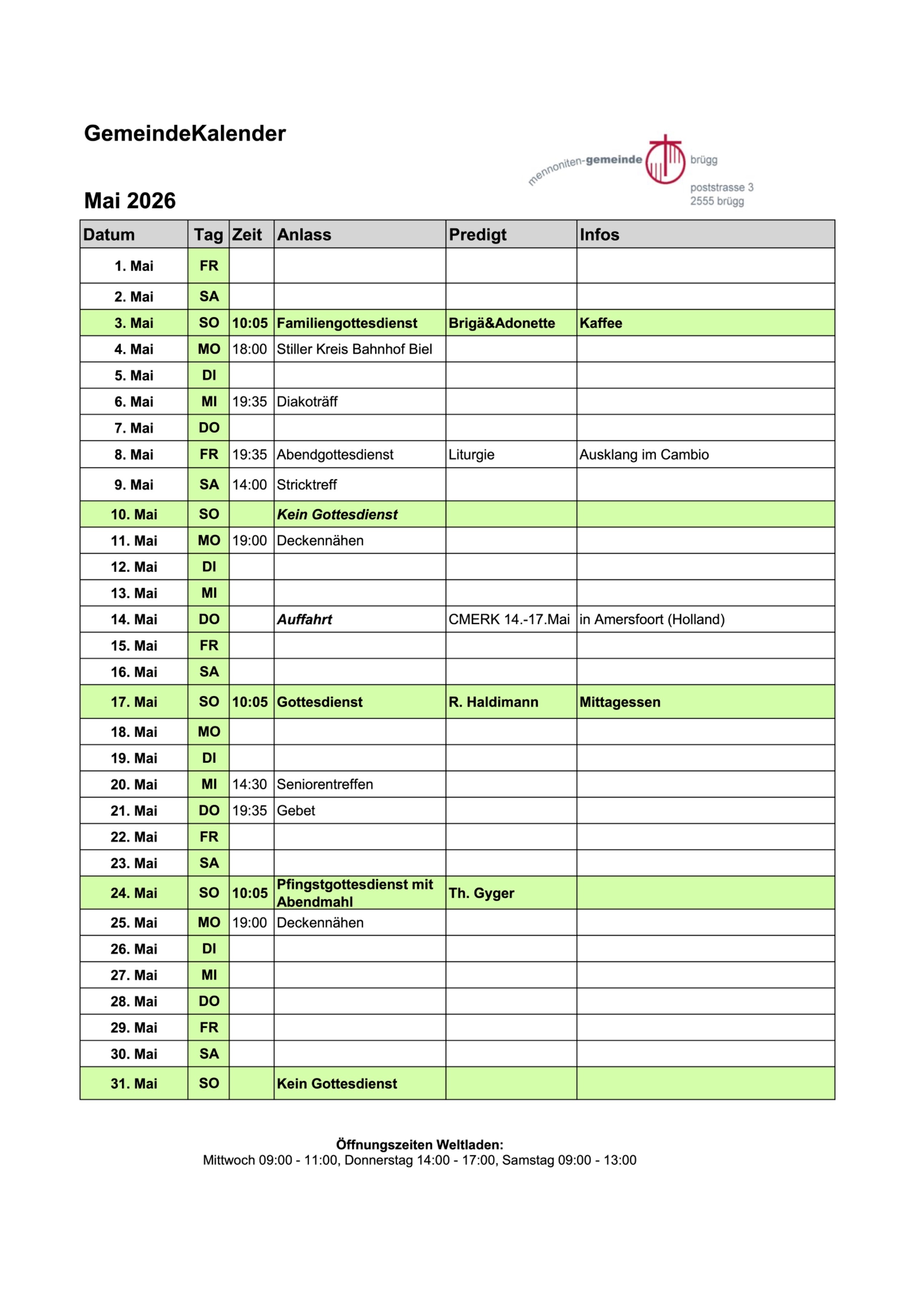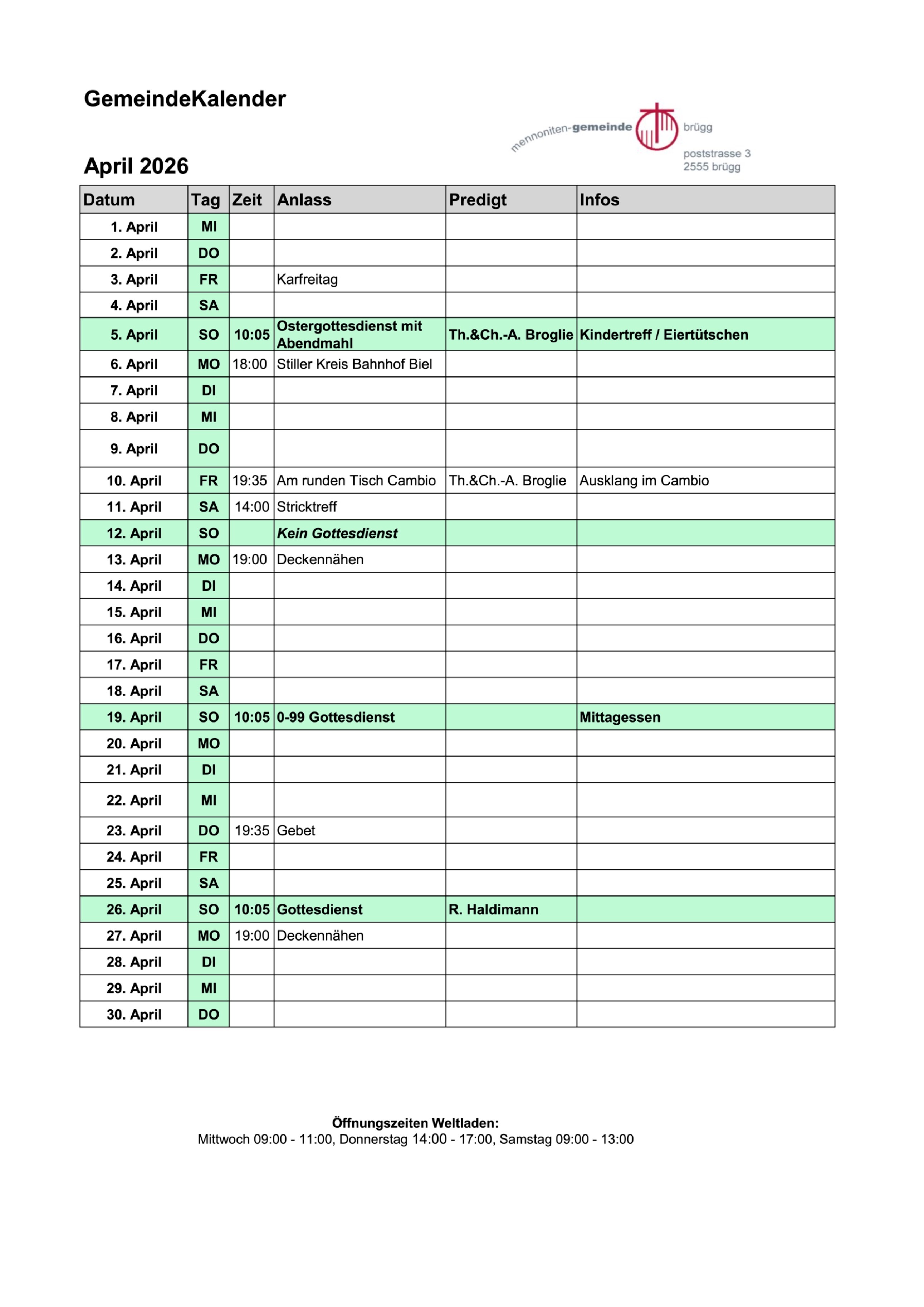 Die Mennoniten Gemeinde Brügg hat zum Zweck, am Bau der Gemeinde Jesu und seinem Reich mitzuarbeiten. Dies tut sie als evangelische Freikirche innerhalb der weltweiten Kirche Christi und als Teil der Mennoniten-Gemeinden der Schweiz.
